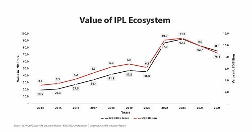 According to the report by D and P Advisory, for the first time in its history, the IPL ecosystem has recorded two consecutive years of valuation decline. The overall value dropped from IND 92,500 crore in 2023 to IND 82,700 crore in 2024 (≈ -10.6%) and has now further contracted to IND 76,100 crore in 2025 (≈ -8.0%). In USD terms, the ecosystem has slid from USD 11.2 billion in 2023 to USD 9.9 billion in 2024, and now to USD 8.8 billion in 2025.